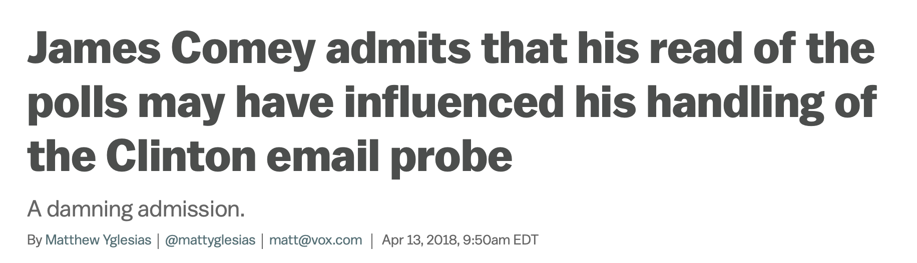 "It is entirely possible that because I was making decisions in an environment where Hillary Clinton was sure to be the next president, my concern about making her an illegitimate president by concealing the restarted investigation bore greater weight than it would have if the election appeared closer or if Donald Trump were ahead in all polls."