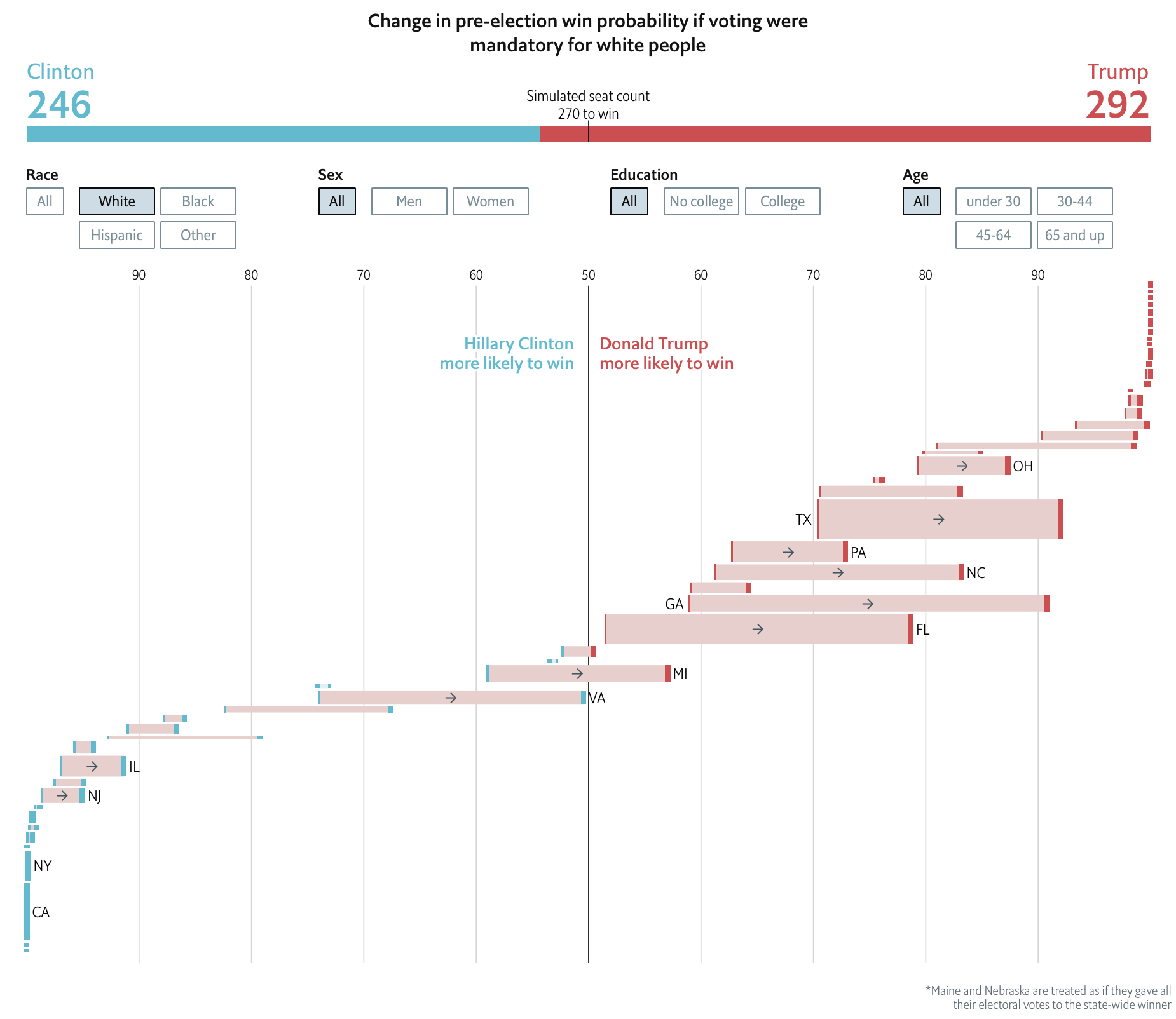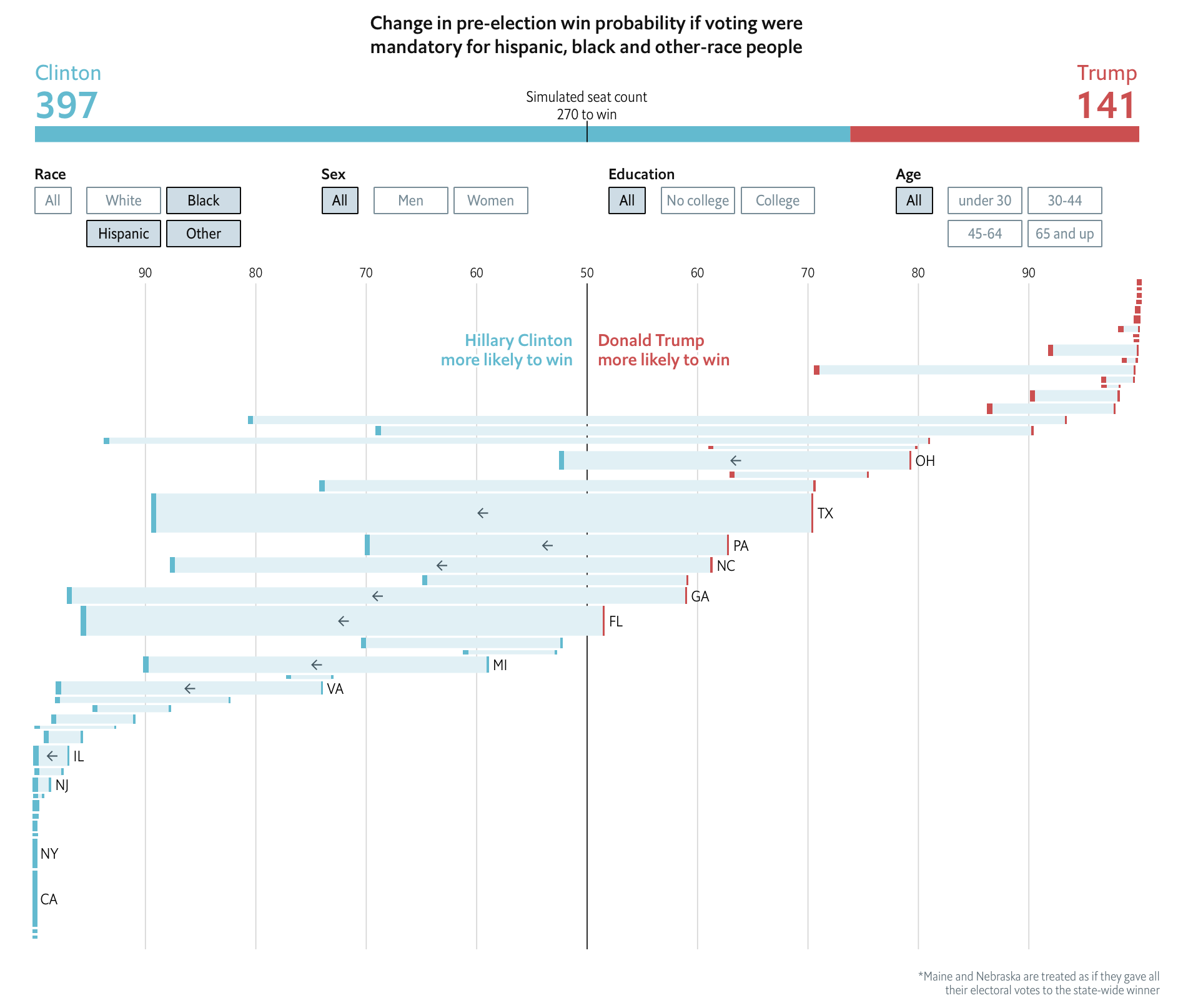 - We can modify the percentage of each group that turns out to vote, then re-predict the election