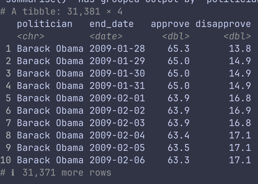 Describe the data. Approval qs, from polls, over time, I calculate an average, etc.